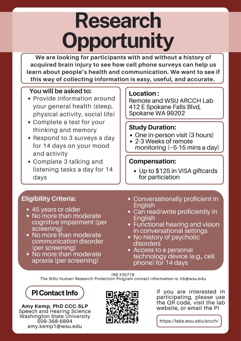 The Accelerating Research in Cognitive Communication Health (ARCCH) Lab at Washington State University (WSU) is looking for participants with and without a history of acquired brain injury (stroke, traumatic brain injury, etc.) and neurodegenerative disorders (mild cognitive impairment, Alzheimer’s Disease, Parkinson’s Disease) interested in a part of a study. We are studying how cell phone surveys can help us learn about people’s health and communication. We want to see if this way of collecting information is easy, useful, and accurate.