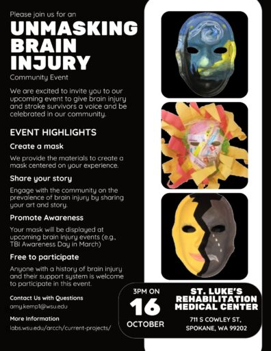 Please join us for the Fall 2025 Unmasking Brain Injury Event held at St. Luke’s Medical Center on October 16th, starting at 3 pm. The address is: 711 S Cowley St, Spokane, WA 99202