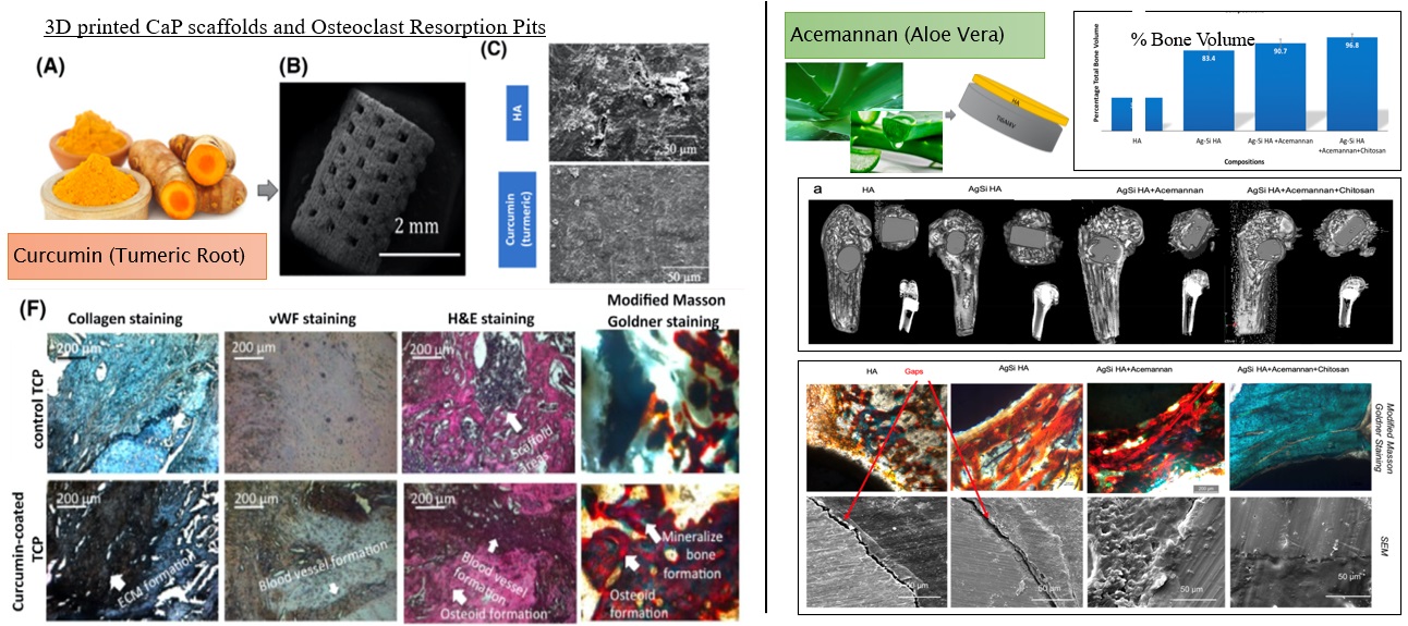 Curcumin is the primary compound found in turmeric root, able to support osteogenesis and cancer inhibition. When loaded in 3D printed calcium phosphate (CaP) bioceramic scaffolds, osteoclastic bone resorption is inhibited, supporting angiogenesis and new bone formation (red-orange). Acemannan is the key component in aloe vera. Acemannan delivery from doped CaP coated Ti metal implants, shows higher bone formation and osseointegration, from CT scans, and osteoid stains.