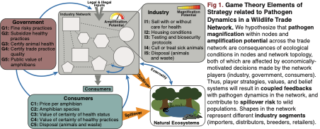 The wildlife trade industry involves an estimated 2.5M live animals, valued >$300B USD, moving among >180 nations per year. This represents a key pathway for the evolution, emergence, and spread of novel pathogens. Zoonotic and wildlife pathogens (e.g., SARS-CoV-2 and chytrid fungi, respectively) have cost global economies trillions of dollars, led to substantial human life and biodiversity loss, and been linked to wildlife trade. Managing disease in live animal trade networks presents distinctive challenges. Various socioeconomic factors can influence the decisions businesses make about the species they trade and the biosecurity practices they use, which in turn can influence the prevalence, persistence, and spread of pathogens. Therefore, animal trade networks represent a bidirectionally coupled system between pathogen-host ecology and decisions made by business, consumer, and government stakeholders (Fig. 1).