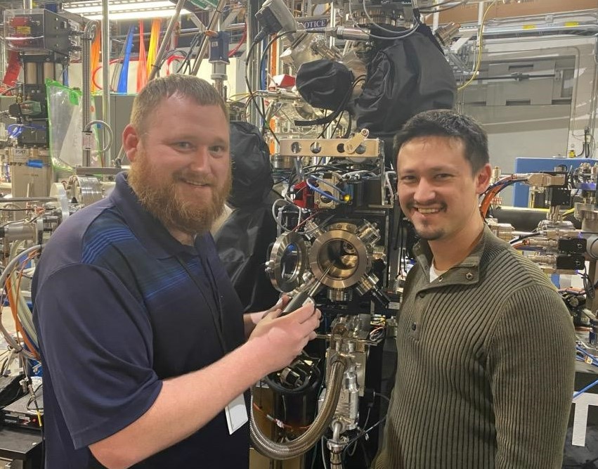 The new RSoXS instrument, funded and built by NIST at the NSLS-II, was designed to enable a microfluidic stage (pictured) to place a ~1um sheet of aqueous sample in front of the X-ray beam (itself in high vacuum). PI Brian Collins and postdoc Terry McAfee (pictured) brought their stage to enable commissioning studies of the new capability.