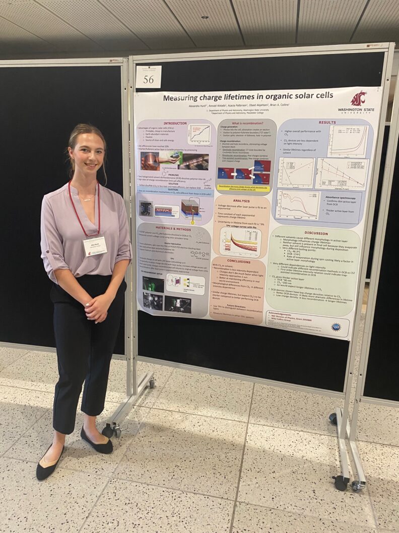 Ally Hurd—a physics undergraduate student at Macalester College—has concluded her REU 2022 Summer internship working with Collins group. Her work focused on quantifying lifetimes of photo-generated charges in printable organic solar cells (OSCs). That included fabrication of OSCs, characterization and optimization of their device performance. Her charge lifetime experiment, known as transient photovoltage (TPV) measurement, involved light sources such as LEDs, a solar simulator, and nanosecond pulsed wavelength-tunable laser. At the end of the internship, Ally presented her work at the 2022 Summer Undergraduate Research Symposium at Washington State University.