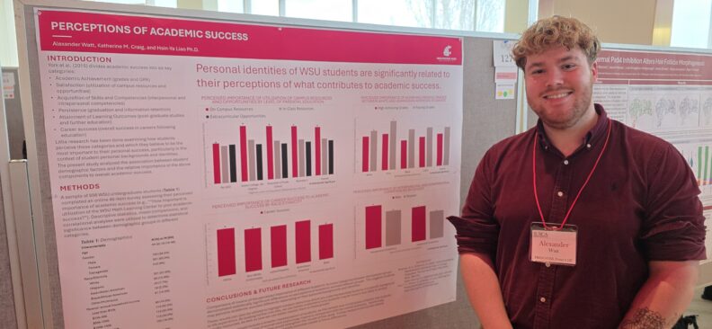 • March 24, 2025- Congratulations to Alex Watt on presenting his honors thesis, “Perception of Academic Success,” and winning the Crimsom Award at the WSU Showcase for Undergraduate Research and Creative Activities (SURCA)!