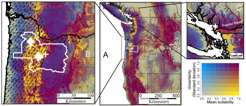 Fig. 3. Ensemble habitat suitability model prediction for emerald ash borer in the Pacific Northwest. Bivariate maps denote ensemble predictions and their uncertainty; the increasing intensities of yellow represent increasing habitat suitability, and increasing blue represent increasing uncertainty. Insert panels on central map A) denote ensemble prediction around recent detections (white plus) in Oregon B) and British Columbia C). The white solid line denotes the quarantine areas established by the Oregon Department of Agriculture, and the slash area denotes Oregon ash distribution.
