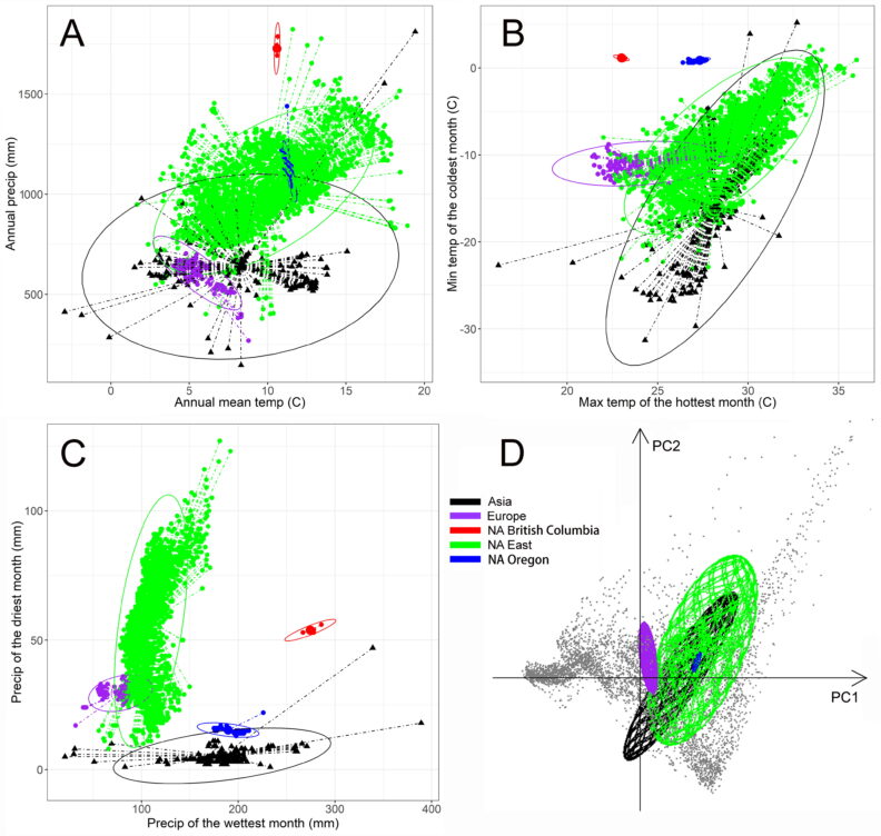 Fig. 1. Comparing climate niche spaces occupied by the introduced Oregon and British Columbia populations with populations in Asia, Europe, and eastern North America. Scatterplots show A) annual trends, B) extreme temperature, or C) extreme precipitation conditions associated with the above populations. Panel D) shows the realized climate niche occupied by emerald ash borer populations in reduced dimensions (principal components PC1 and PC2).
