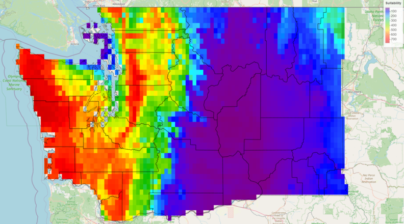 We used habitat suitability models and dispersal simulations to assess potential invasive spread of V. mandarinia. We show V. mandarinia are most likely to establish in areas with warm to cool annual mean temperature, high precipitation, and high human activity. The realized niche of introduced populations is small compared to native populations, suggesting introduced populations could spread into habitats across a broader range of environmental conditions. Dispersal simulations also show that V. mandarinia could rapidly spread throughout western North America without containment. Given its potential negative impacts and capacity for spread, extensive monitoring and eradication efforts throughout western North America are warranted. Here is the potential distribution of Northern giant hornet in Washington.