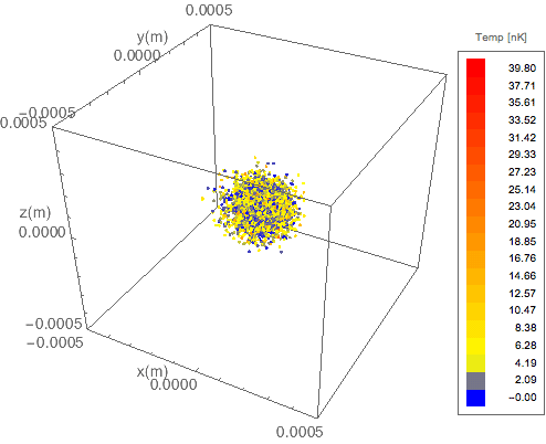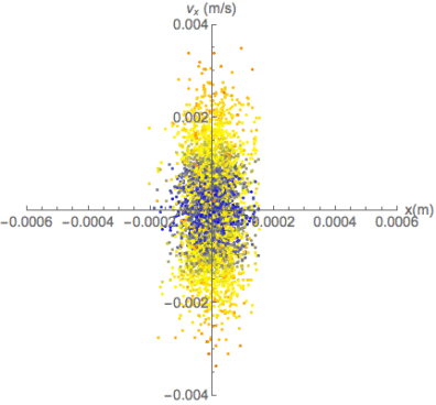 An example of this technique can be seen in the above GIFs (click to see the simulation!), where atoms have been prepared in a spherically symmetric magnetic trap. The color of each atom represents its “temperature” based on the velocity distribution of the atom. The atoms move around in the trap for a bit before the trap is suddenly jumped off. In gravity, the center of mass of the atoms would be accelerating down at a rate of 9.81 m/s^2 as the atoms expand, but in microgravity, the center of mass of the atoms stays in the same place relative to the apparatus. After a certain amount of time, the same spherical magnetic trap is applied to the atoms again, applying a force on the atoms that varies spatially: a strong force to the atoms far from the center of mass, moving out at higher speeds; and a weak force to the atoms near the center of the distribution, already at relatively low velocities. You can see that when the “kick” happens, all of the atoms turn blue, as they are now in the 1nK and below regime. This can also be seen in the phase space diagram of the same system.