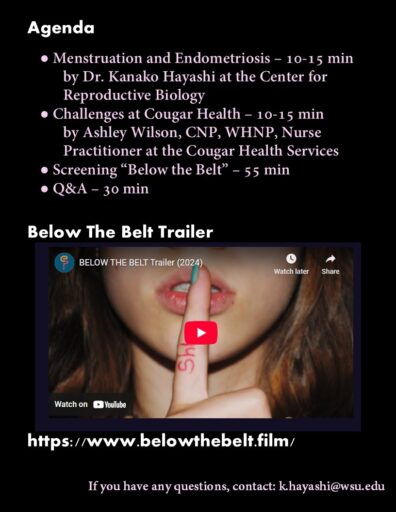 I am pleased to announce our first outreach program at WSU Pullman. We will host our inaugural event on October 16 at CUE419, from 5-7 pm, featuring the screening of “Below The Belt,” a documentary film about endometriosis, followed by a discussion on the topic, including menstruation, pain, and reproductive health.