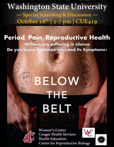 I am pleased to announce our first outreach program at WSU Pullman. We will host our inaugural event on October 16 at CUE419, from 5-7 pm, featuring the screening of “Below The Belt,” a documentary film about endometriosis, followed by a discussion on the topic, including menstruation, pain, and reproductive health.