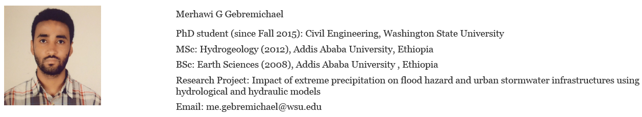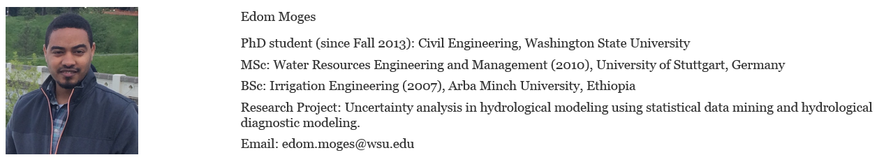 - Edom Moges (PhD in Civil Engineering, Graduated in Aug 2018, Currently a Post-doctoral associate at U.C. Berkeley)
