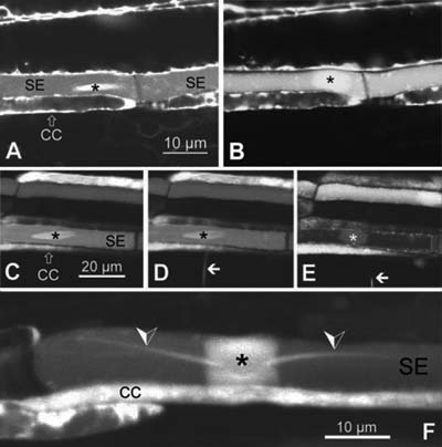 Forisomes (asterisk) in sieve elements (SE) of broad bean (A-E) and green bean (F). They are spindle shaped in the low volume state (A,C,D). After injury they contract longitudinally and swell radially, which leads to a significant volume increase and occlusion of the sieve tube (B,E,F). In green been forisomes have long terminal extrusions called tails. Their morphology is of taxonomic significance (see Peters et al. 2010 in the literature section.) Figure from Knoblauch et al. 2001. Calcium regulated stopcocks in legume sieve tubes. Plant Cell 13 1221-1230. Copyright: American Society of Plant BiologistsA forisome attached to two glass capillaries (upper left). Application of calcium medium leads to longitudinal contraction. Significant force generation is indicated by pulling the glass capillary (upper right). In contrast to other biological motor proteins, forisomes excert force during contraction and expansion. No ATP is necessary to drive the reaction. From Knoblauch et al. 2003 ATP independent contractile proteins from Plants. Nature Materials 2, 600-603. Copyright: Nature Publishing Group