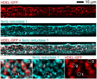 Super-resolution images of a sieve tube ER membrane protein (ferric reductase) and GFP freely expressed into the ER lumen showing two distinct ER domains. From: Proteomics of isolated sieve tubes from Nicotiana tabacum: sieve element–specific proteins reveal differentiation of the endomembrane system. PNAS 2021, https://doi.org/10.1073/pnas.2112755119 Copyright: Proceedings of the National Academy of Science.