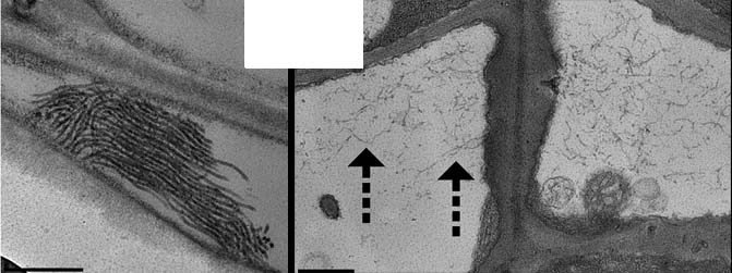 A bundle of filaments (left) and individual filaments (right) in mature sieve elements, derived from dispersive P-protein bodies. From Froelich et al. (2011) Phloem ultrastructure and pressure flow: SEOR protein agglomerations do not affect translocation. Plant Cell doi/10.1105/tpc.111.093179 Copyright American Society of Plant Biologists