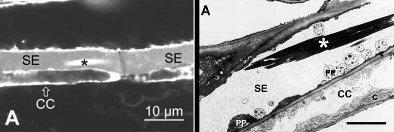 Non dispersive P-protein bodies (asterisk) as seen in the confocal microscope (left) and the transmission electron microscope (right). SE= sieve element, CC = companion cell. From Knoblauch et al. (2001) Calcium regulated stopcocks in legume sieve tubes. Plant Cell 13, 1221 – 1230. Copyright American Society of Plant Biologists