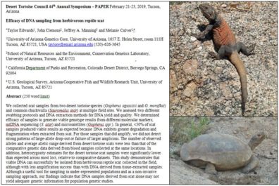 2/2019 – A presentation titled “Efficacy of DNA sampling from herbivorous reptile scat” from Dr. Manning’s collaborative work with Drs. Taylor Edwards (University of Arizona), John Clemons (University of Arizona), and Melanie Culver (University of Arizona, USGS) was given at the 44th Annual Desert Tortoise Council Symposium in Tucson, AZ, February 21-23.