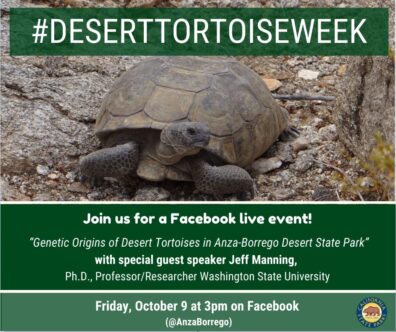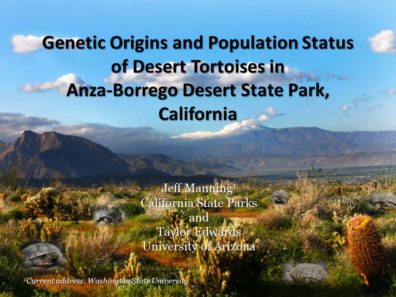 10/2020 – A special guest presentation titled “Genetic origins and population status of desert tortoises in Anza-Borrego Desert State Park, California” by Dr. Manning live broadcast streamed and posted on the Anza-Borrego Desert State Park Facebook page. October 9. Link