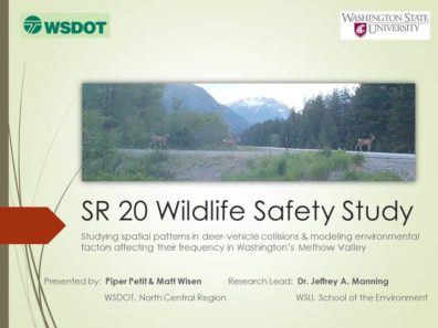 2/2019 – A presentation titled “Studying spatial patterns in deer-vehicle collisions & modeling environmental factors affecting their frequency in Washington’s Methow Valley” from Dr. Manning’s work for Washington’s Department of Transportation (Piper Petit and Matt Wisen) was given at the Mule Deer Summit at the Okanogan Trails Chapter of the Mule Deer Foundation on Feb. 23.