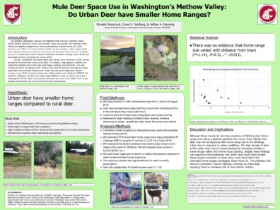 3/2019 – A presentation titled “Mule Deer Space Use in Washington’s Methow Valley: Do Urban Deer have Smaller Home Ranges?” from WSU Undergraduate Intern Shayleh Shamrock (co-mentored by Dr. Manning and Dr. Caren Goldberg) was given at the 8th Annual Showcase for Undergraduate Research and Creative Activities Symposium in Pullman, WA, March 25. This study was part of Dr. Manning’s larger investigation into deer-vehicle collisions for Washington’s Department of Transportation (Piper Petit, WSDOT lead). The SURCA is administered by the WSU Office of Undergraduate Research.