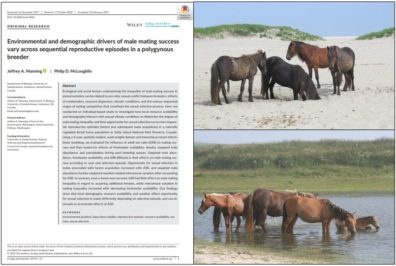 2/2019 – Dr. Manning coauthored an article titled “Environmental and demographic drivers of male mating success vary across sequential reproductive episodes in a polygynous breeder” from an intensive, individual-based field study on wild horses on Sable Island, Canada that is accepted into the journal Ecology and Evolution. The authors’ results show that local demography, resource availability, and weather have differential effects on opportunity for sexual selection in males across selection episodes that make up the sexual selection process, effectively attenuating or accentuating effects of adult sex ratio. Read it online at: https://onlinelibrary.wiley.com/doi/epdf/10.1002/ece3.5066.