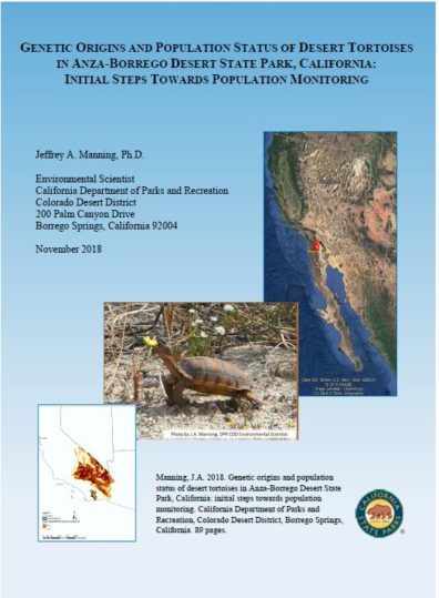 2/2019 – This agency report titled “Genetic origins and population status of desert tortoises in Anza-Borrego Desert State Park, California: initial steps towards population monitoring” was authored by Dr. Manning just prior to coming to WSU. Jeff was employed as an Environmental Scientist with California State Parks at the time he conducted this work. It involved various collaborations, including with Dr. Taylor Edwards (University of Arizona), Dr. Lyndon Murray (CDPR), and Dr. Caren Goldberg (WSU). This report is representative of Jeff’s work for agencies over the years. (Click on the image to read the report)