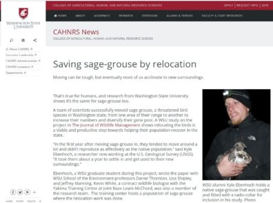 8/2019 – Former WSU M.S. student Kyle Ebenhoch was interviewed by CAHNRS News (titled “Saving Sage-grouse by Relocation“) about his graduate research. The interview emphasizes the resulting published article on effects of post-release movements on survival of translocated sage-grouse. The research team included WSU professors Daniel Thornton, Lisa Shipley, and Jeff Manning and Kevin White from the Yakima Training Center at Joint Base Lewis-McChord.