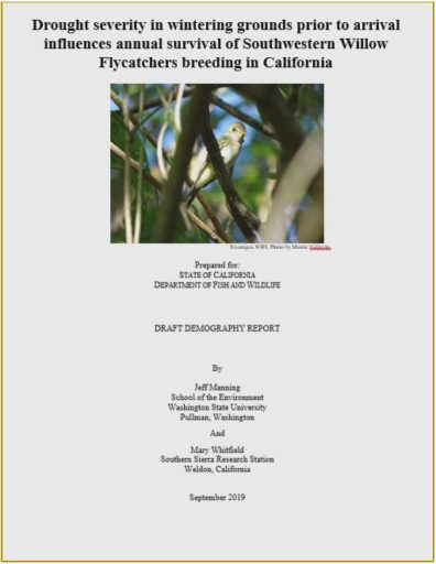 9/2019 – This agency report titled “Drought severity in wintering grounds prior to arrival influences annual survival of Southwestern Willow Flycatchers breeding in California” was authored by Dr. Manning and Mary Whitfield of the Southern Sierra Research Station (SSRS). Jeff collaborated with the SSRS to carry out this research, which involved developing geographically explicit long-term regional climate indices for overwintering and migration ranges, as well as annual breeding ranges of this neotropical migrant bird, and linking these geographic and temporally explicit climate metrics to long-term willow flycatcher demographic data breeding in the Kern River Valley, California. Funding was provided by U.S. Fish and Wildlife Service Endangered Species Grant Program.