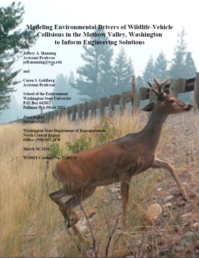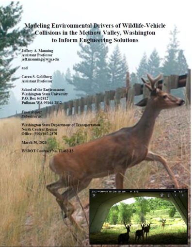 3/2020 – This agency report titled “Modeling environmental drivers of wildlife-vehicle collisions in the Methow Valley, Washington to inform engineering solutions” was authored by Dr. Manning and Dr. Caren Goldberg. This project involved radio-tracking, extensive field data collection using trail cameras, UHF data loggers, and visual observations, which fed into spatiotemporal modeling of environmental drivers of the wildlife-vehicle collision process. Funding was provided by Washington Department of Transportation. (Click on the image to read the report)