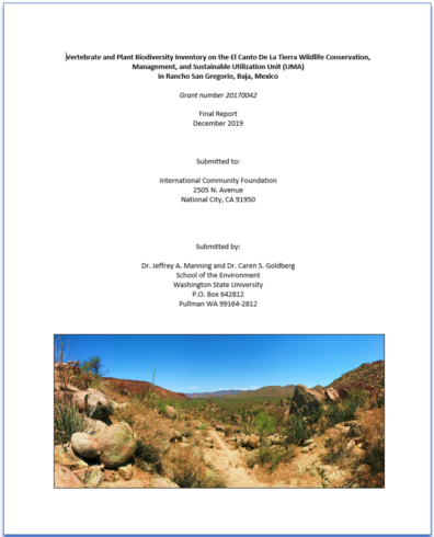 9/2020 – This report titled “Vertebrate and plant biodiversity on the El Canto De La Tierra Wildlife Conservation, Management, and Sustainable Utilization Unit (UMA [from its name in Spanish]) in Rancho San Gregorio, Baja, Mexico” was authored by Dr. Manning and Dr. Caren Goldberg. This project involved extensive field sampling and mapping of vertebrates and plant assemblages, which was used to create a classified landcover map and identify biodiversity hotspots. Funding was provided by the International Community Foundation.