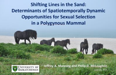 - As a Research Fellow at the University of Saskatchewan, Jeff led 3 separate studies on the environmental and demographic drivers of sex ratios, polygyny thresholds, and sexual selection in wild horses on Sable Island National Park, Canada (Manning et al. 2015, Manning and McLoughlin 2017, Manning and McLoughlin 2019).