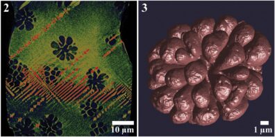 Phase separated LaCaMo-X silicate glass displaying dendtritic powellite crystals, and segmented silica-rich phase separation. (From Bussey et al., 2023) |