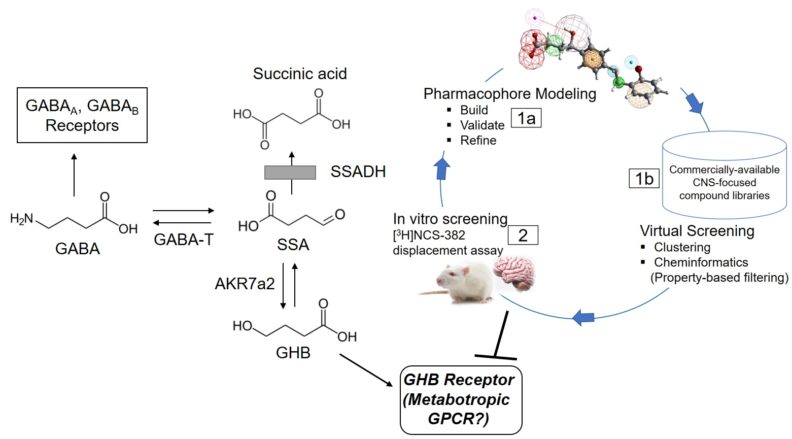 Succinic semialdehyde dehydrogenase deficiency (SSADHD), though an ultra-rare disease (diagnosed in ~200 patients worldwide), is the most prevalent inherited disorder of GABA metabolism. The disease presents with non-specific mild to moderate developmental delay, severe expressive language impairment , epilepsy, and neuropsychiatric problems. Functional deficiency of SSADH prevents the conversion of succinic semialdehyde to succinic acid, resulting in excessive accumulation of neurotransmitters g-aminobutyric acid (GABA) and the GABA analogue g-hydroxybutyrate (GHB), and use-dependent down-regulation of GABA and GHB receptors. Blocking GHB receptors with specific antagonists has been shown to rescue SSADH-deficient mice from premature lethality and may provide therapeutic benefits to patients with SSADHD. In the absence of biophysical and structural information of the GHB receptor, a ligand-based pharmacophore-modeling and virtual screening strategy is being implemented to find high-affinity small molecules with potential GHB receptor antagonist activity.