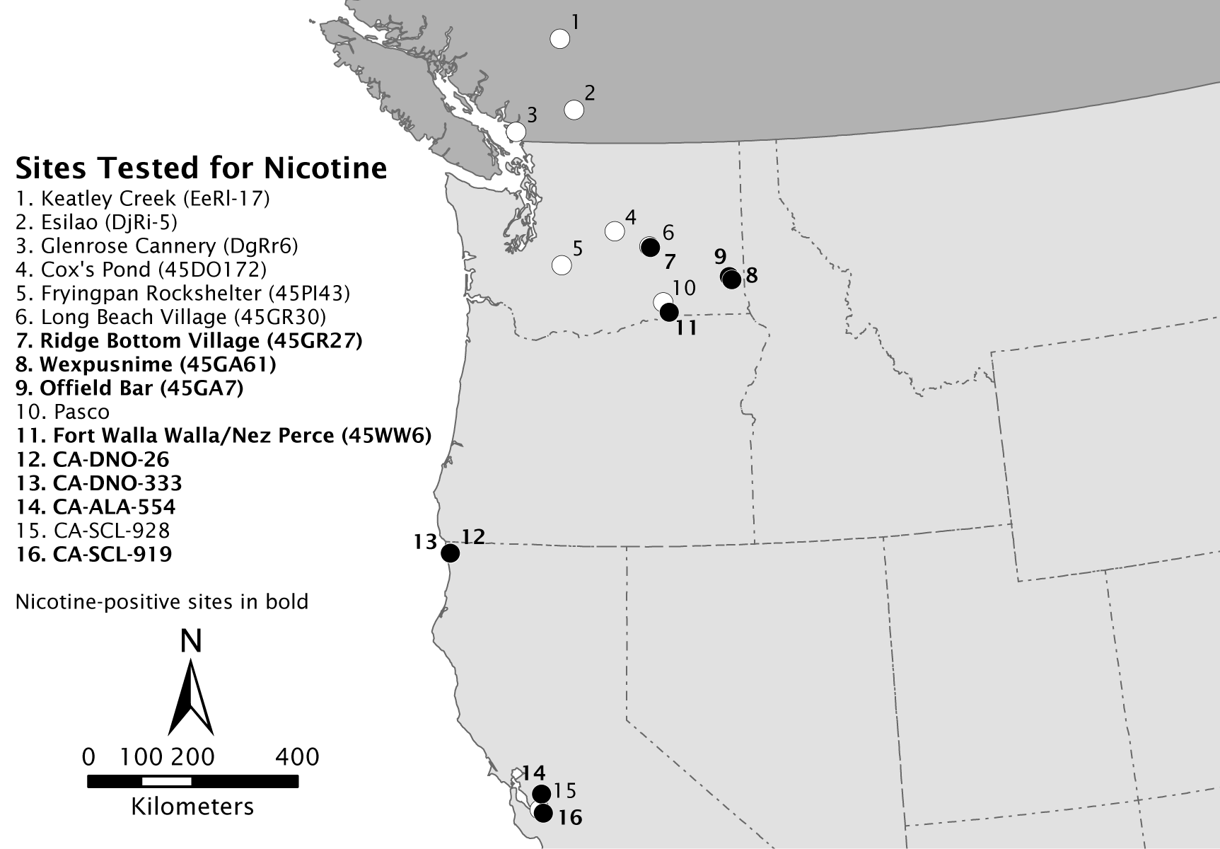 In order to explore the antiquity of the smoking practices and the important relationship with tobacco of the indigenous peoples of the Pacific Northwest, researchers associated with the Psychoactive Plants Project have examined stone smoking pipes from around the region. The simple presence of smoking pipes is taken as evidence of past smoking practices and by considering the distribution of such artifacts across the region we have been able to build a picture of the past distribution of smoking. Pipes and pipe fragments, made of steatite, basalt, and sandstones, appear in archaeological sites throughout the Inland Pacific Northwest, most frequently along the Upper Snake and Lower Columbia Rivers but on the British Columbia Plateau as well along the Fraser and Thompson Rivers. These artifacts date from as long as c. 4,500 years ago until the time of the arrival of Euroamericans in the region, showing an impressive time depth to the Native practice of smoking. Analysis of the chemical residues trapped in these artifacts has shed light on what was being smoked in the past. Nicotine, taken as an indicator for tobacco use, has been identified in seven artifacts from sites along the Upper Snake and Lower Columbia (Tushingham et al. 2018) and a single artifact from a site on Moses Lake in central Washington (Damitio 2018) demonstrating that people indigenous to the Inland Northwest were smoking tobacco as long ago as c. 1,500 years before present. It is also worth noting the pipes and pipe fragments that tested negative for nicotine. Pipes from other sites in central Washington and in British Columbia were all found to not contain nicotine, a finding that may show that central Washington was the northern limit for tobacco use and range extension in the pre-Contact era.