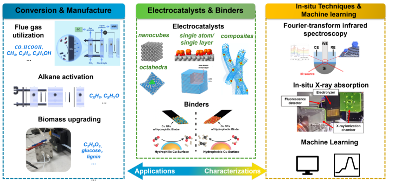 Our research group is passionately engaged in the field of electrocatalysis, focusing on innovating electrocatalytic applications and enhancing our fundamental understanding of reaction mechanisms via in-situ characterizations. We are pioneering in innovating electrocatalytic applications on alkane activation, flue gas conversion, and biomass upgrading via catalysts-characterization-computation (C3) approach. We investigate the complex dynamics of molecular interactions under electrical influence, aiming to unravel the reaction pathways and the evolution of catalysts during the reaction in real time. Our methods include using in-situ X-ray, infrared, and Raman spectroscopy to investigate surface reaction intermediates and monitor catalyst evolution. We approach our research with the mindset of a scientist as a detective to explore the fundamental reaction mechanisms driving chemical reactions.