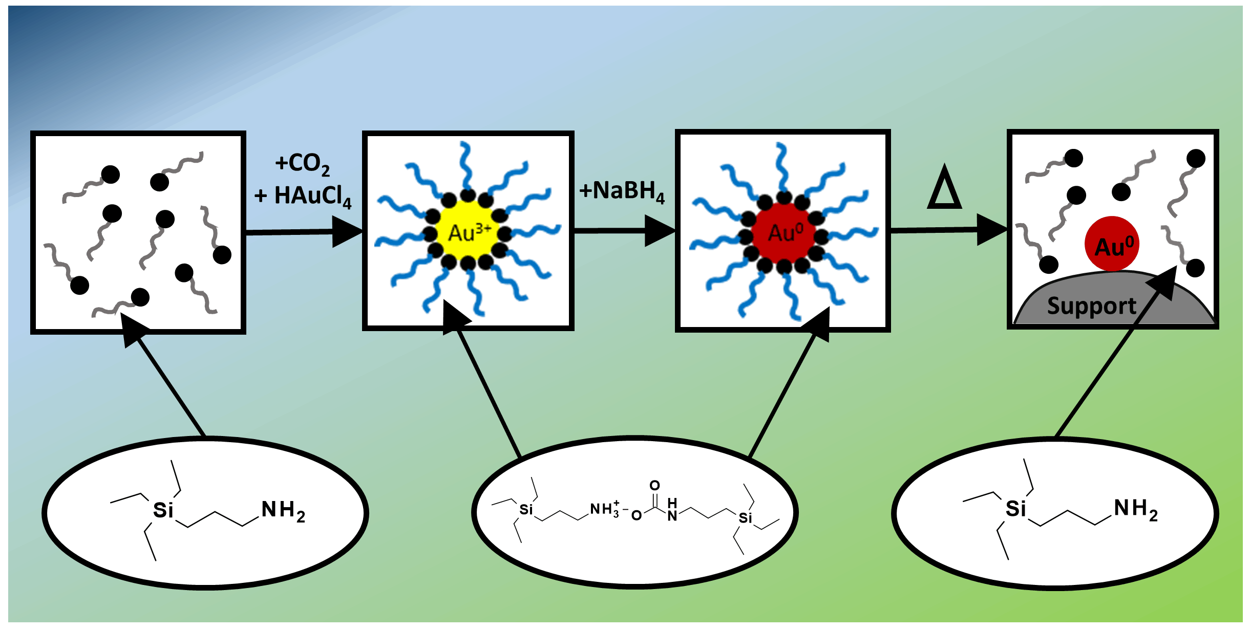 The work investigated the use of switchable surfactants (one that can be turned on or off like a light switch)  to prepare nanoparticles.  The novelty of this system is seen in the switchability of the surfactant:  in the on state, the surfactant stabilizes and helps disperse gold nanoparticles while in of the off-state, the surfactant doesn’t interact strongly with the gold.  We leverage this to prepare supported nanoparticle catalysts that are more active than traditionally prepared nanoparticle catalysts with less processing!