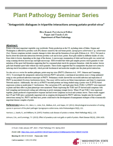 Hira Kamal gave a talk at our department seminar January 30, 2023 Tanaka Lab January 30, 2023 – Hira Kamal gave a seminar at the Plant Pathology Seminar at WSU.