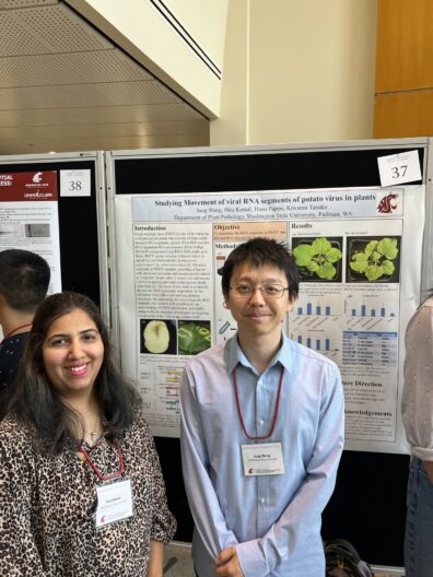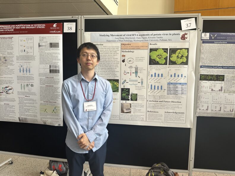 August 4, 2023 – Jerry Wang, an undergraduate student at WSU, successfully concluded his internship and showcased his internship research through a poster presentation at the WSU Summer Research Symposium. Special thanks to her mentor, Hira Kamal, for her guidance and support.   This internship was a component of the summer REU programs led by IBC faculty Andrei Smertenko and Laura Bartley, funded by NSF and USDA. Eighteen trainees, based in the labs of PIs Bates, Sanguinet, Sullivan, Steber, and Tanaka, presented at the WSU summer research symposium supported by the WSU Office for Undergraduate Research.