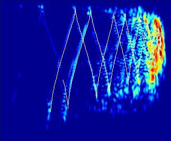 Acoustic timefront of a pulse propagated through a simulated ocean.