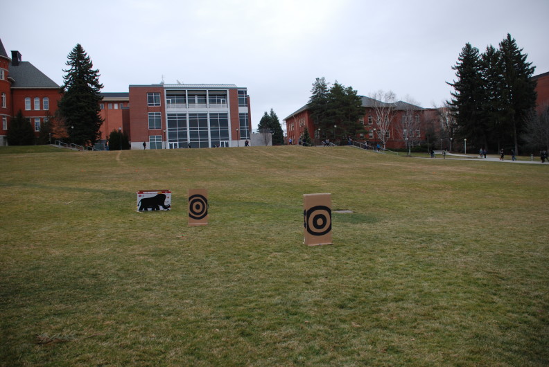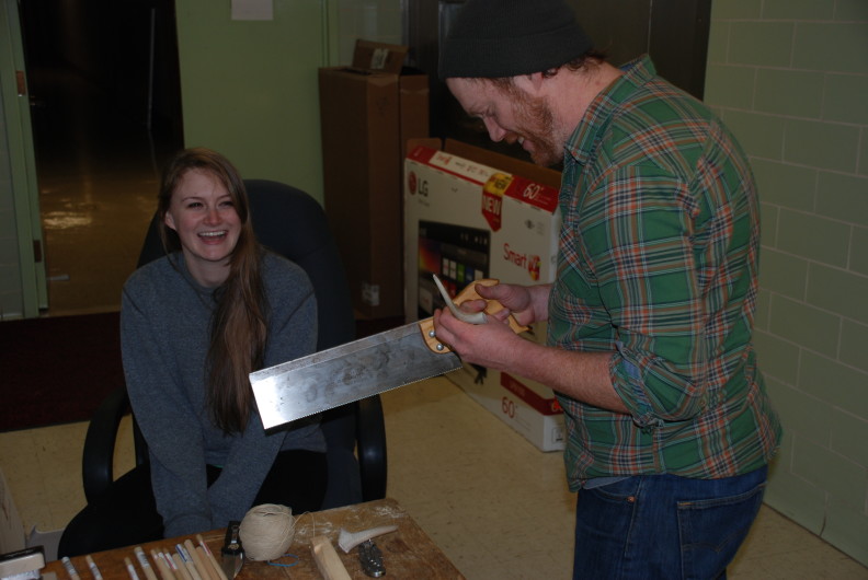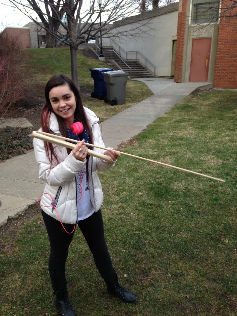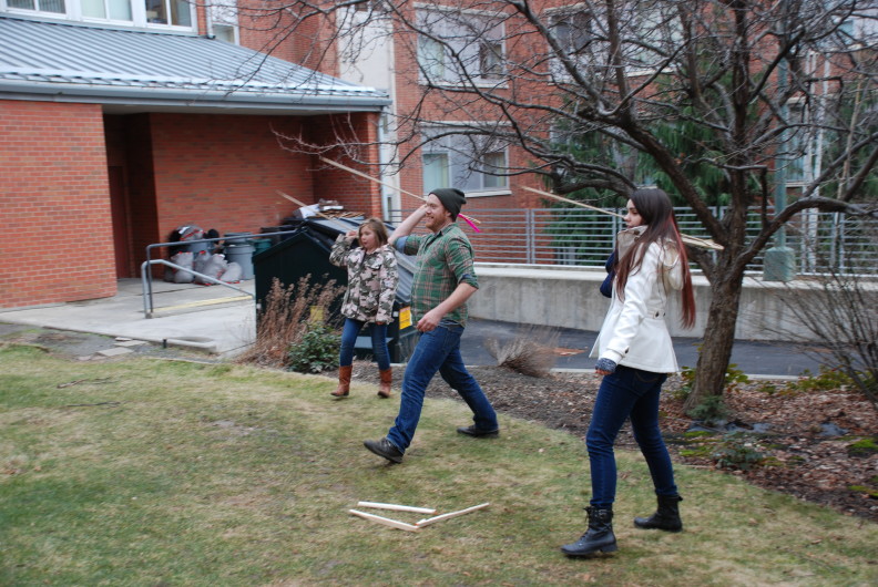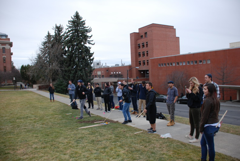 colin.christiansenTushingham Lab personnel joined Anthropology Collections Lab personnel and graduate students in some experimental archaeology this month. Participants created atlatl throwing sticks and darts from simple materials to serve as educational tools for the Anthropology Museum. Over the span of a few days, the group whittled, cut, sanded, taped and glued until they had amassed 12 atlatl throwing sticks and 20 darts. Rigorous field tests were conducted and flight data was analyzed until the perfect dart design was achieved. That is, the perfect design for a large class of inexperienced students. (Read: non-lethal). On February 11, 2016 the inaugural atlatl throwing session took place at Thompson Flats on the WSU campus, performed by the Spring 2016 Anthropology 334 class.