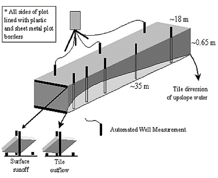 Figures from Brooks, Boll, McDaniel, 2004 WRR: Contour map of hillslope plot in Troy, Idaho demonstrating drainage of sloping land. Wells identified with a circle were read hourly. Wells identified with a cross were read during site visits.